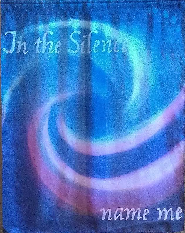 This piece was made for a contemplative service, to denote peace, silence, and digging deeper into one’s center. I began envisioning a black hole, with everything being drawn in and down to the deep. The thing about a black hole is, that even though everything gets drawn in, there is also light that gets thrown back out again! An interesting idea when thinking about the results of having a meditation practice in my life. On this one, I brushed on a light double-graded wash before waxing out the lettering and continuing with more color.